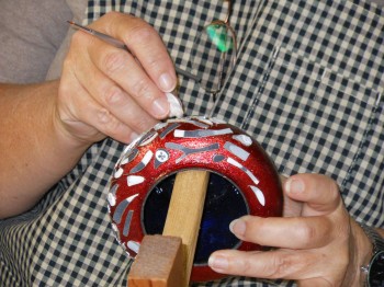 (3番)3人の作家さんは少しづつ仕上がりの度合いに差が出てきましたが、真剣な中にも楽しんでいる雰囲気が伝わります。赤透の技法を教える七宝職人さんも、外国人の作家の仕事ぶりや、道具の使い方から得るものがあるようです。